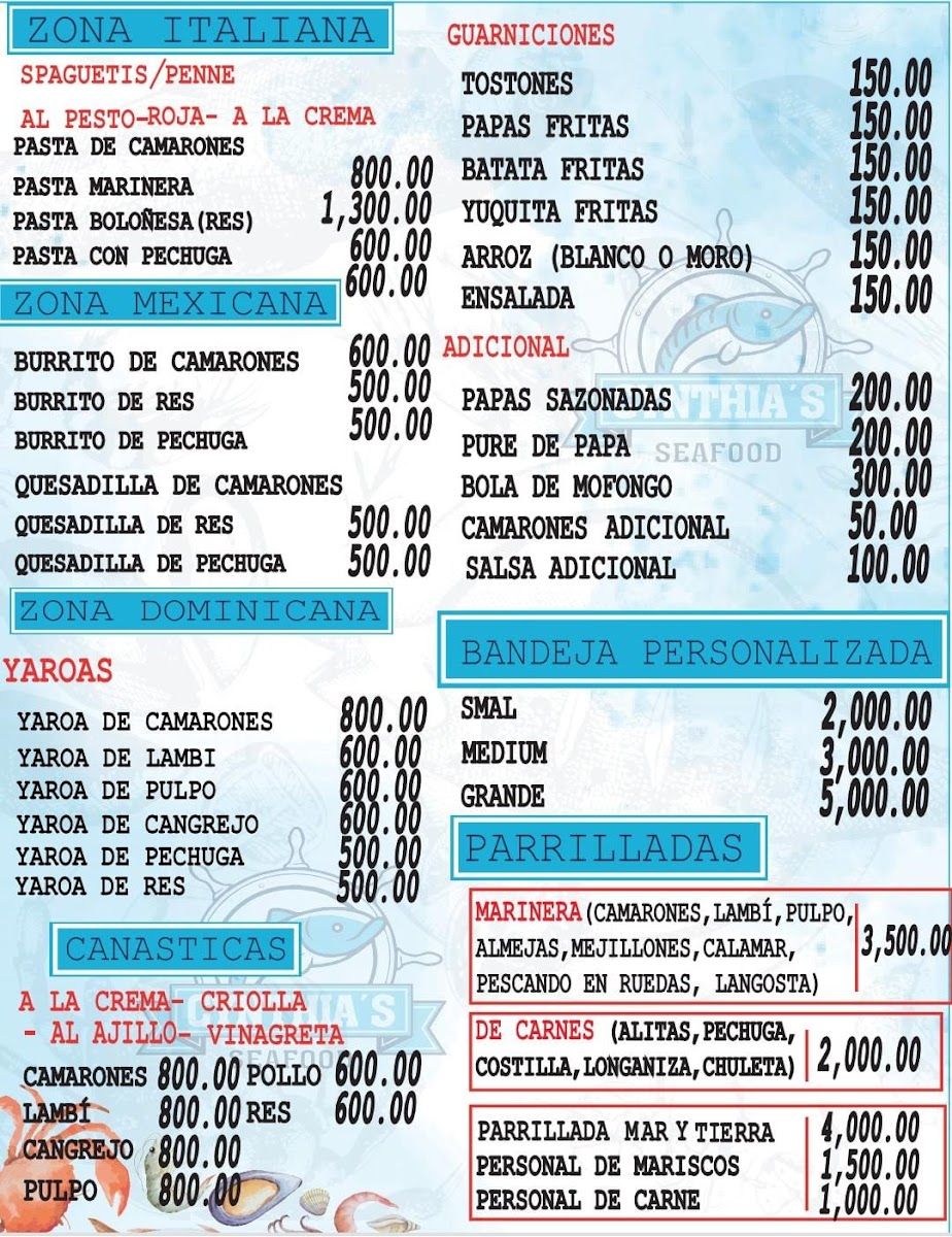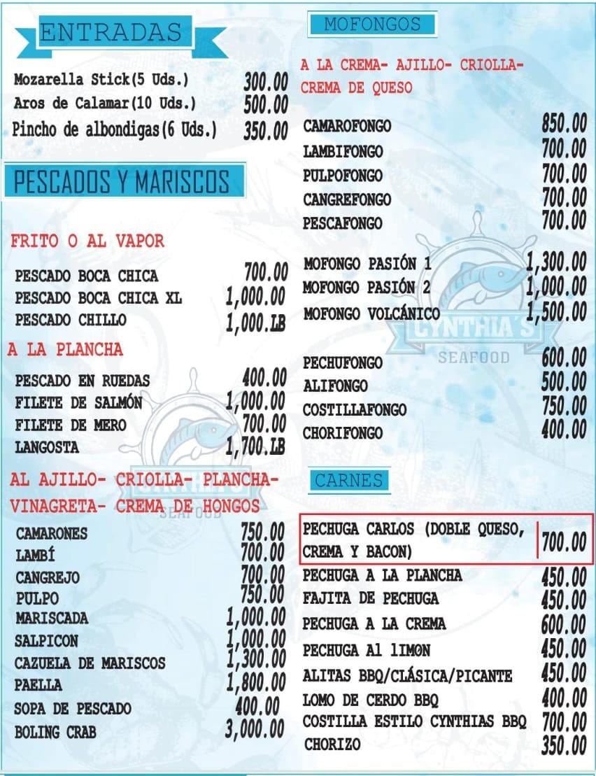 Cynthia's Seafood in Santo Domingo offers a diverse and flavorful menu that celebrates the best of seafood. The standout dishes on the menu include the crispy and golden Mozarella Stick, perfect for those looking for a delicious appetizer. For a heartier option, the Boiling Crab delivers a satisfying experience with its tender crab served in a seasoned broth, ideal for seafood lovers. The Mariscada Porciones Divididas is another popular choice, offering a variety of seafood options served in generous portions, making it perfect for sharing. Lastly, the Cazuela de Marisco is a must-try, with its rich and savory seafood stew, full of fresh ingredients. Cynthia's Seafood provides a comprehensive menu that caters to every seafood craving, ensuring a memorable dining experience.